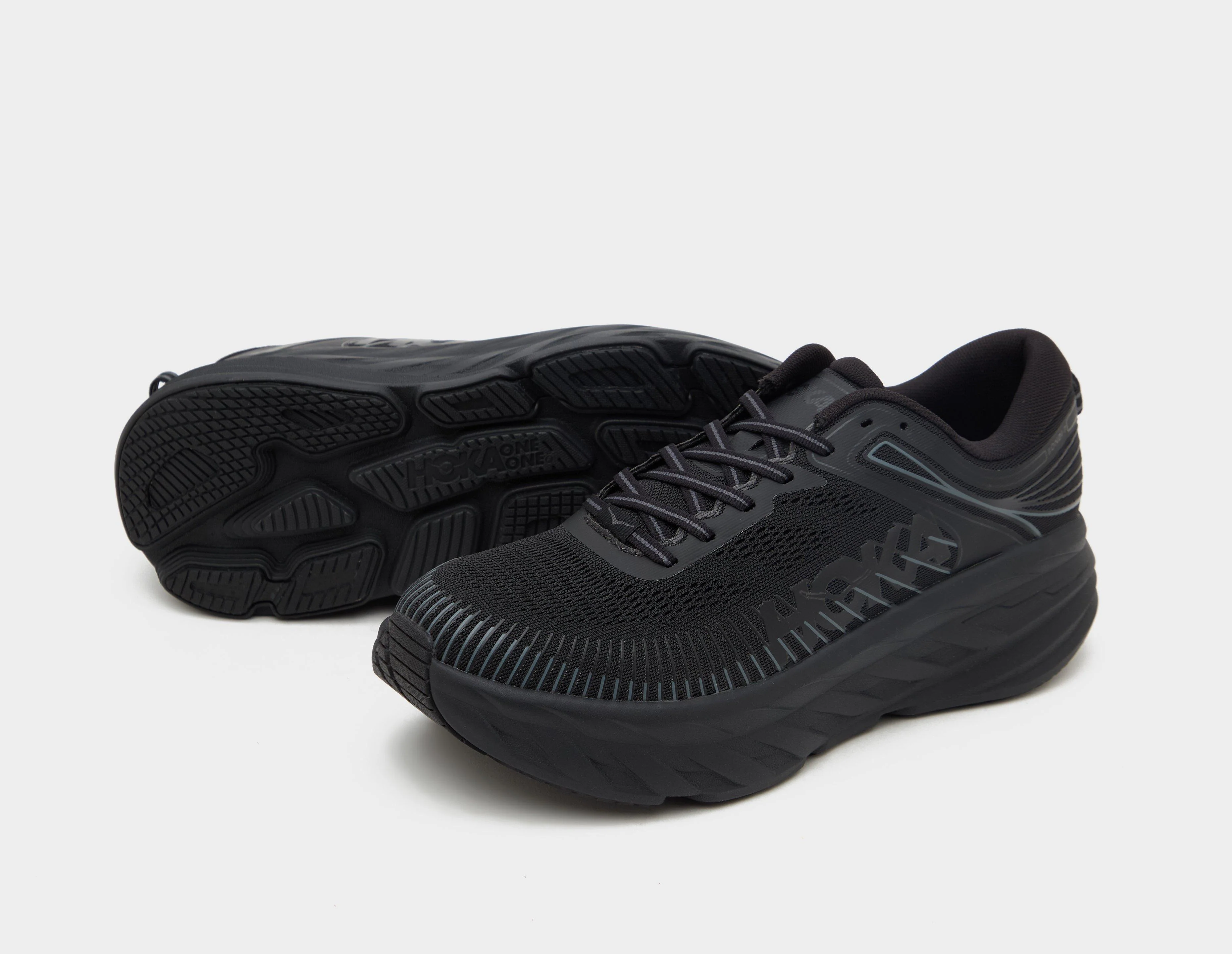 HOKA's most cushioned road shoe yet, the Bondi 7 in black offers smooth transitions and a balanced underfoot feeling. Engineered mesh wraps the upper, while an updated memory foam collar conforms to a wider range of ankle sizes, improving foothold and comfort. Below, Meta-Rocker technology and a full EVA midsole combine to deliver a stable, cushioned ride. | 1110518-BBLC